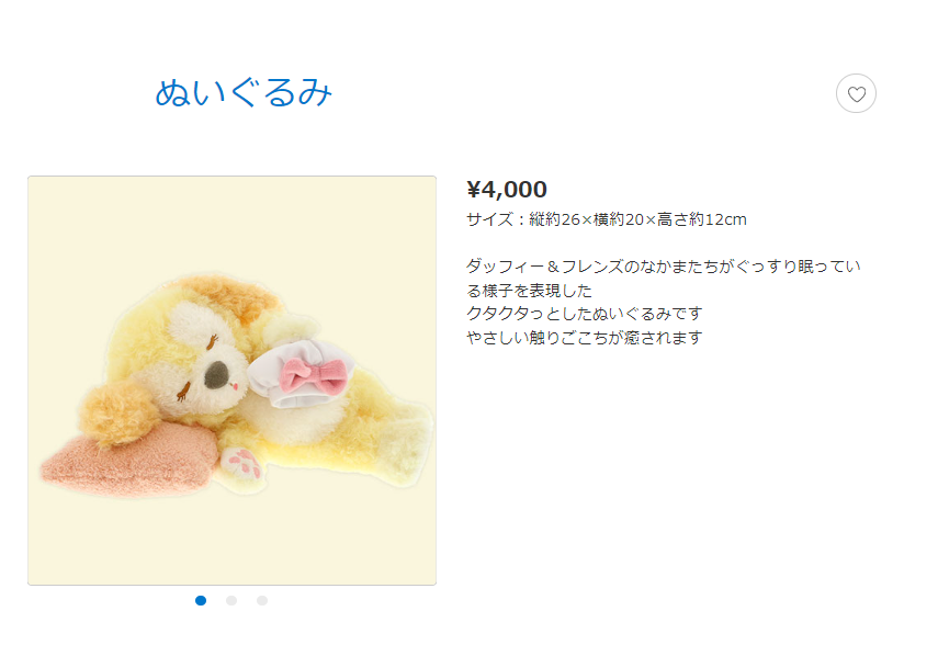 シリーズのぬいぐるみの中でも人気が高く、ダッフィー、シェリーメイに次いで3番目くらいに持っている人を多く見かけます。